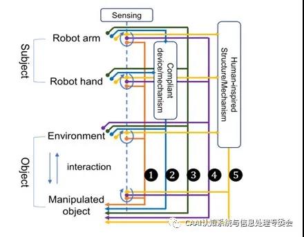 在高精度的抓取和裝配工作中,僅僅依靠機械手本身的精度不能滿足任務要求。近期在IEEE TRANSACTIONS ON MECHATRONICS 上發表的一篇名為《A Survey of Methods and Strategies for High-Precision RoboticGrasping and Assembly Tasks—Some New Trends》的文章對近年來在機器人高精度抓取和裝配方面的研究工作進行了分類、回顧和比較,并闡述了該領域的研究趨勢。 文章介紹了高精度機器人操控的五類方法:(1)基于傳感信息的方法(2)基于柔順機構的方法(3)基于環境約束的方法(4)基于感知約束集成的方法(5)仿生的方法。如圖1所示,示意圖展示了五類方法之間的差異。在機器人操控中,主體是機器人的手臂和手,客體是環境和被操控的對象。虛線表示傳感信息,回路表示傳感器感知到的最新狀態。