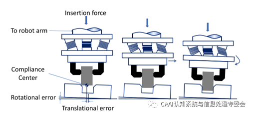 (1)遠端柔性中心(RCC) RCC是由Whitney和Nevins發明的,用于幫助機器人完成插入和裝配任務[41]。在他們的研究中,他們廣泛地討論了機器人的插入過程[42]。在插入過程中,銷釘會在軸向旋轉夾持器下傾斜,這稱為柔性中心。如圖3所示,RCC裝置實際上是一個有6個自由度的彈性機構,可以改變系統柔度中心的位置。在[43]中開發了一種具有計算機可調阻抗的主動柔性末端執行器。目前,將RCC與其他設備或控制方法相結合是非常有研究價值的課題。